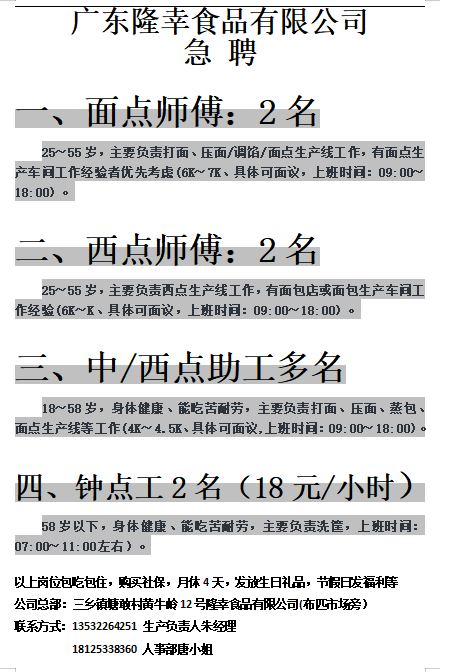 三乡隆幸中央厨房诚聘: