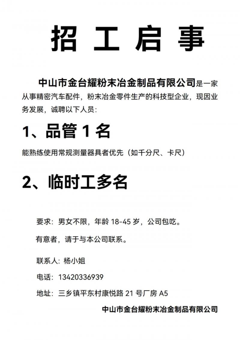 中山市金台耀粉末冶金制品有限公司是一家从事精密汽车配件,粉末冶金零件生产的科技型企业,现因业务发展,诚聘以下人员: