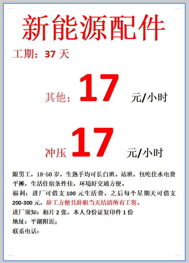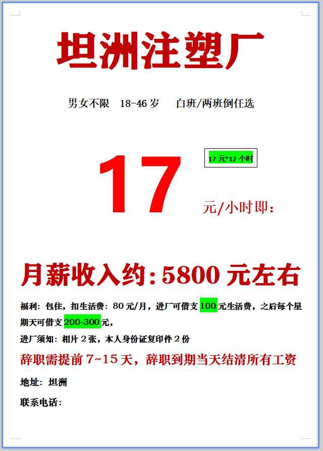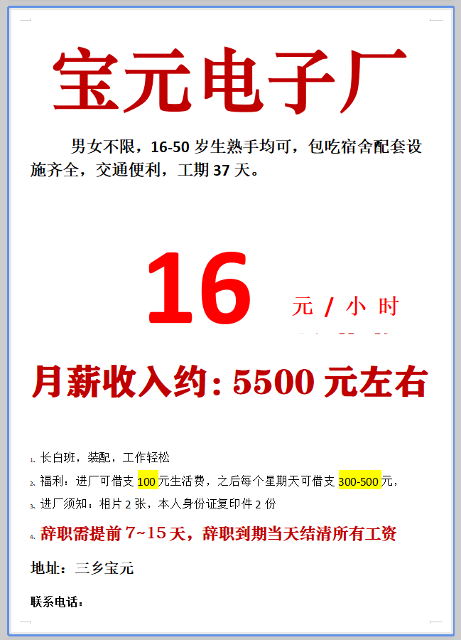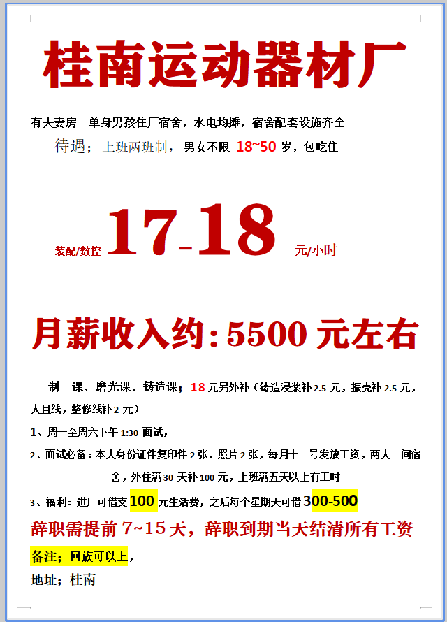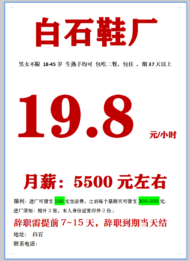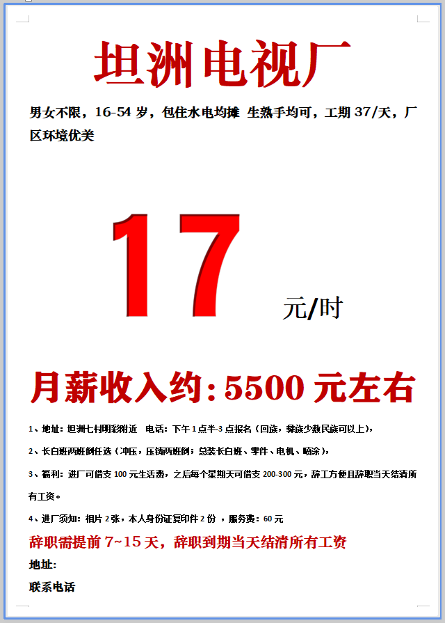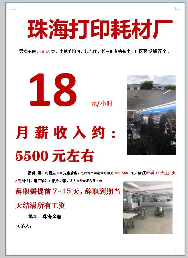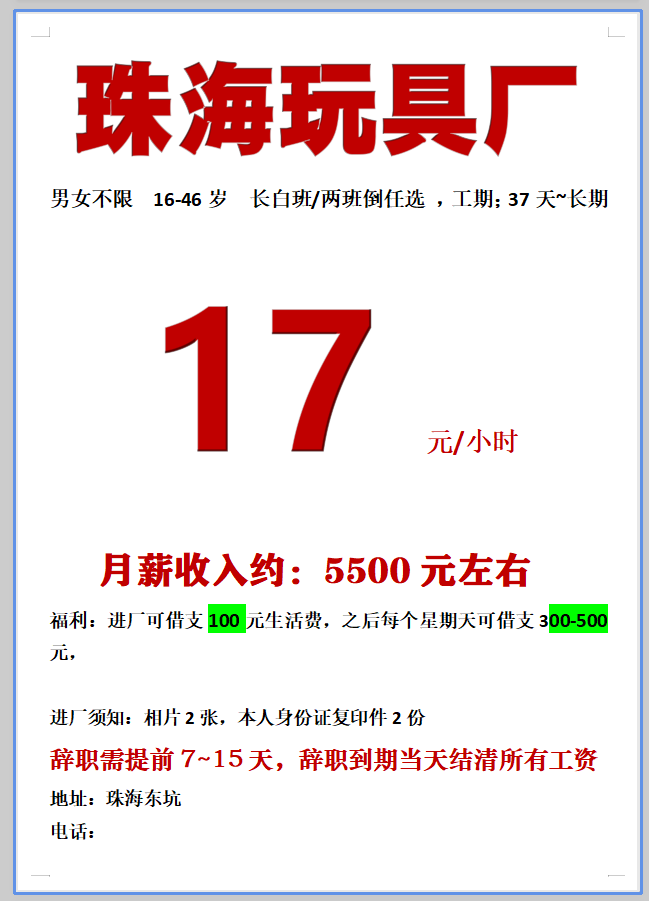 日结工,短期工,小时工,长期工都有。电子厂,电器厂,玩具厂,鞋厂,五金厂……,有回走的,男女不限,年龄16到55岁,包吃包住,有找工作的可以与我联系,有回民的或者彝族的,批量的与
