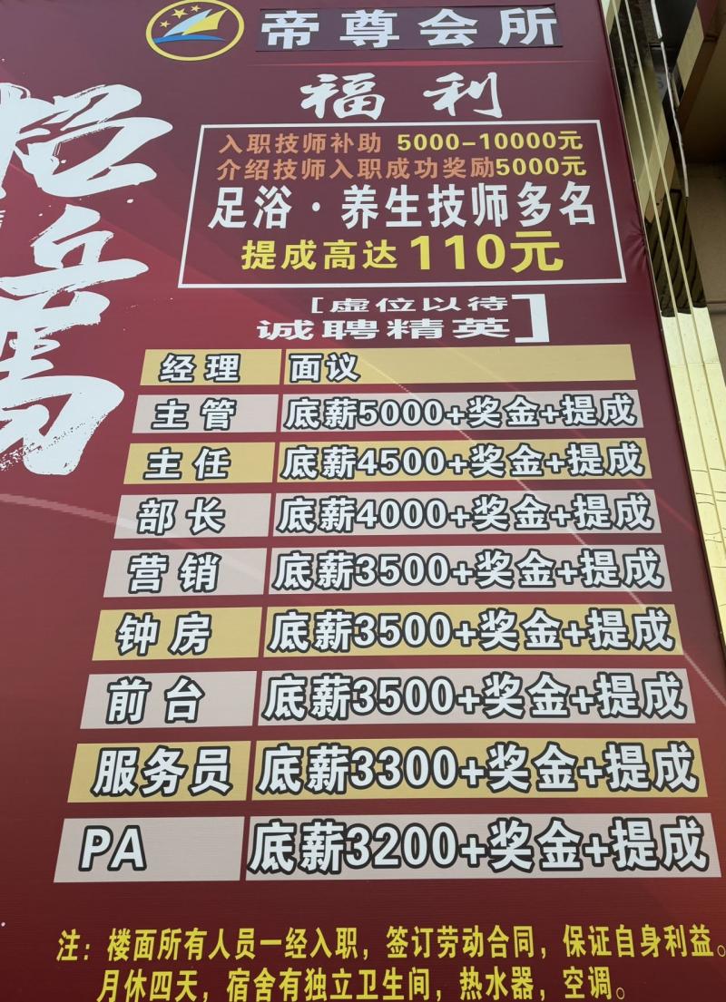 招聘足浴技师多名 长期工临时工新熟手均可(会培训统一手法) 提成高达120 入职技师有补助。另招楼面各岗位人员 薪资待遇面议可电联或➕微资讯
