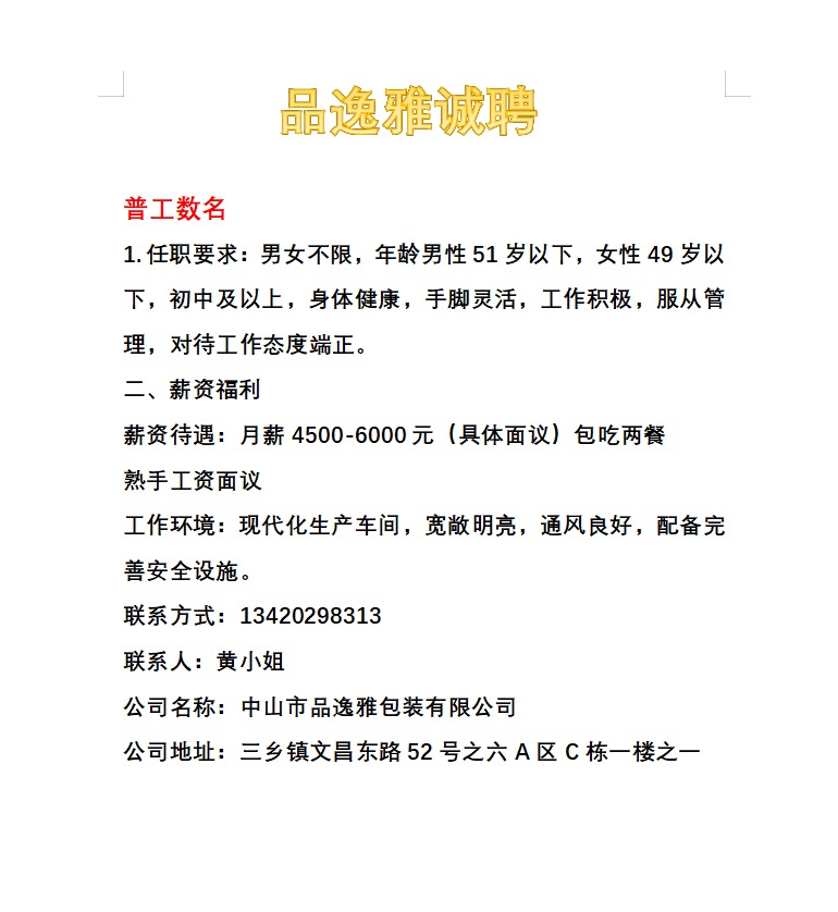 招聘普工 做事麻利 手脚灵活 服从安排