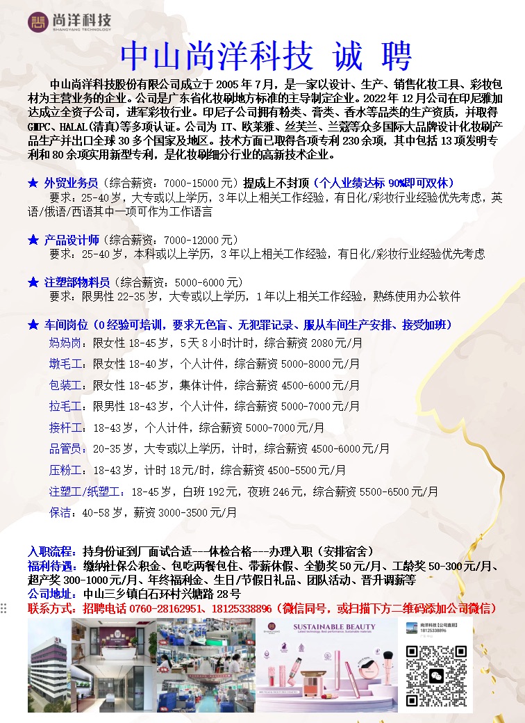 招聘普工,妈妈岗,品管,业务员,设计师