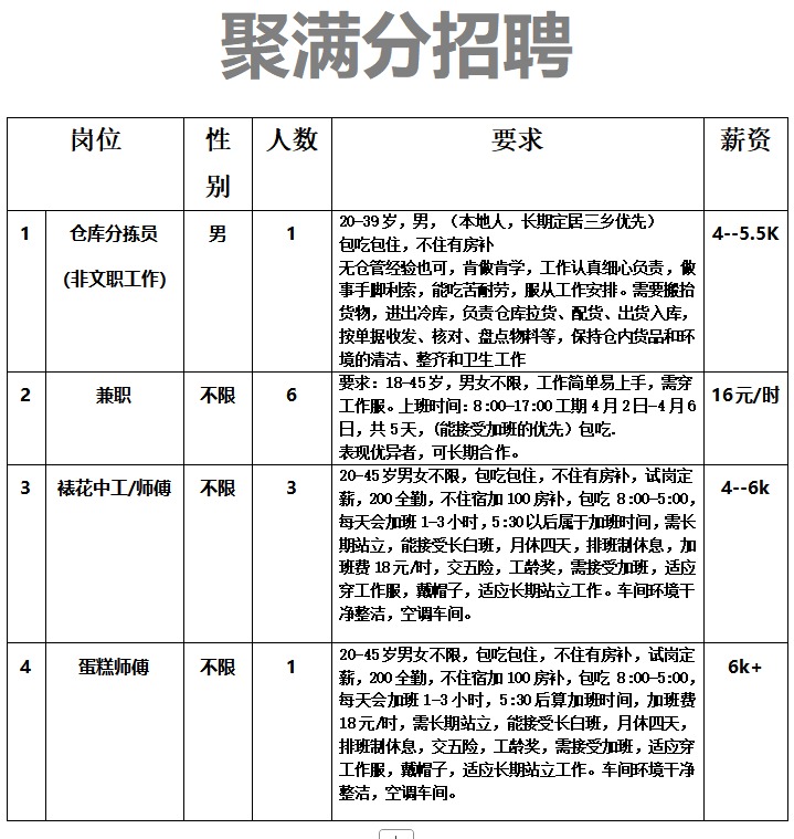 工期4月3日-4月6日,共4天,(能接受加班的优先)16元/时,4月15日结算工资,包吃.表现优异者,可长期合作。