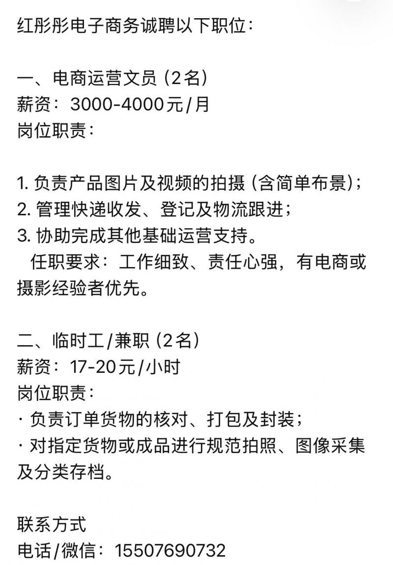 任职要求:工作细致、责任心强,有电商或摄影经验者优先。
